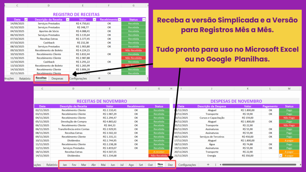 Excel + Google Planilhas, nas versões Simplificada e Mensal. Tudo incluso.